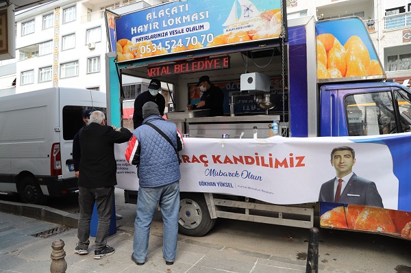 Kartal Belediyesi Sosyal Yardım İşleri Müdürlüğü tarafından ilçenin en kalabalık noktalarına kurulan ikram araçlarına vatandaşların ilgisi yoğun oldu. Kartal Merkez Cami Önü, Cevizli Çınar Caddesi, Soğanlık Kültür Merkezi karşısı, Yakacık Mahalle Muhtarlığı önü ve Topselvi Merkez Cami önünde hazır bekleyen ikram araçlarında vatandaşlara lokma ikramında bulunuldu. Lokma ikramının yanında Miraç Kandili nedeniyle kurulan çadırlarda da kandil simidi dağıtıldı. Belediye personelleri lokma ve simitlerini almaya gelen vatandaşlara Kartal Belediye Başkanı Gökhan Yüksel’in selamlarını iletilerek, kandillerini kutladı.
